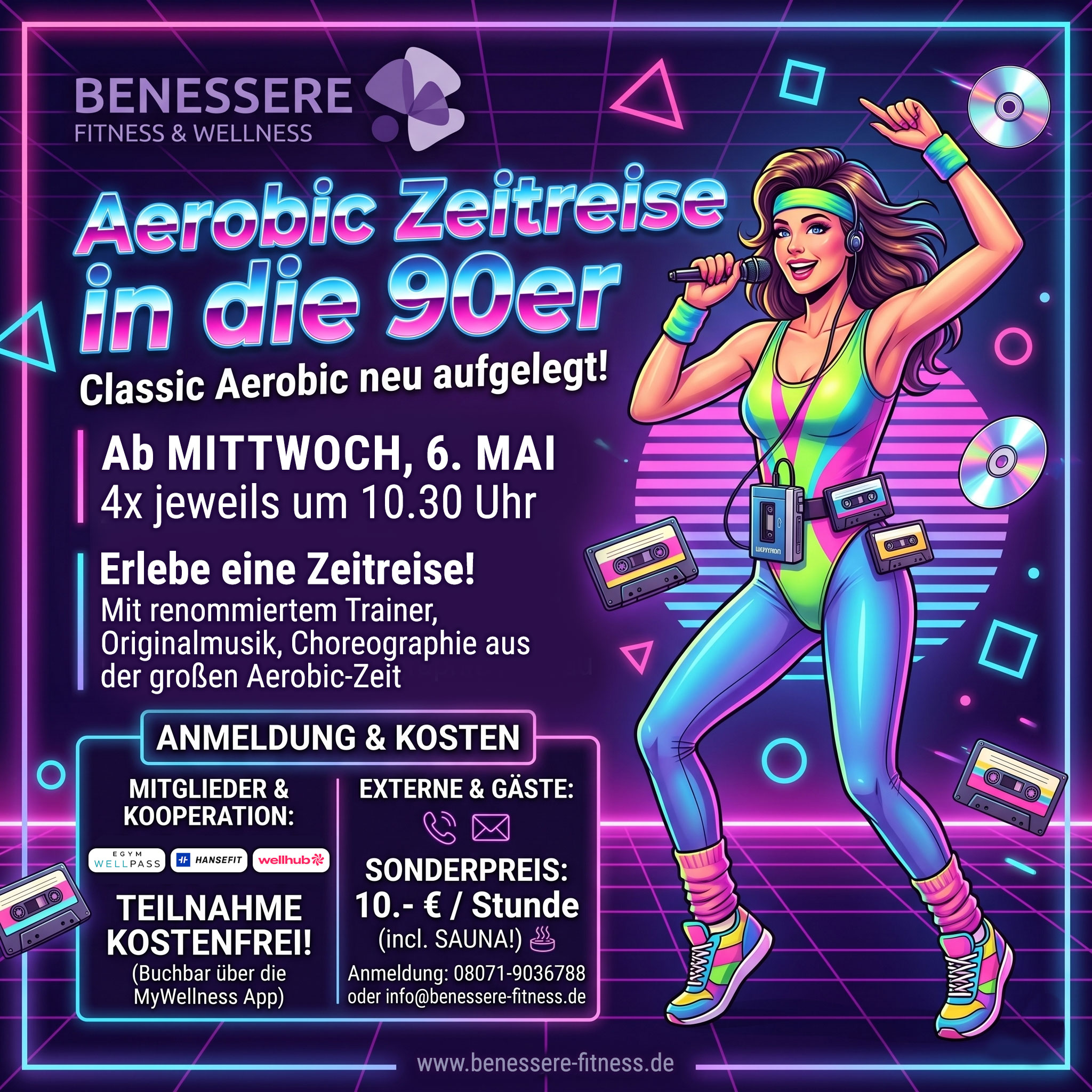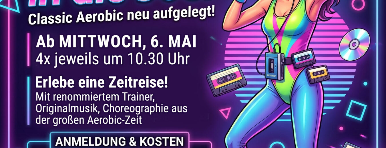Ab 6. Mai, 10.30 Uhr, bieten wir vier Wochen lang jeden Mittwoch für alle Freunde des klassischen Aerobics eine Zeitreise in die 90er an.
